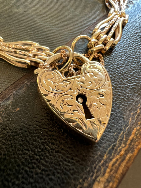 Beautiful antique Bracelet hand made in solid 9ct yellow gold. Fastened with a lovely large engraved heart padlock. Featuring 4 bars, interlocked with oval sections, and pretty engraving on both sides. The padlock is large and heavy, engraved on one side with the other side plain to take an inscription. Generous length of approximately 19mm not including clasp. Finished with a fine safety chain.