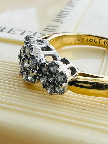 A dazzling display, would make a lovely engagement ring or dress ring as it is very wearable with flat, smooth settings. Very pretty white sparkly diamonds, in a nice solid 18ct yellow gold band. All in excellent condition.
